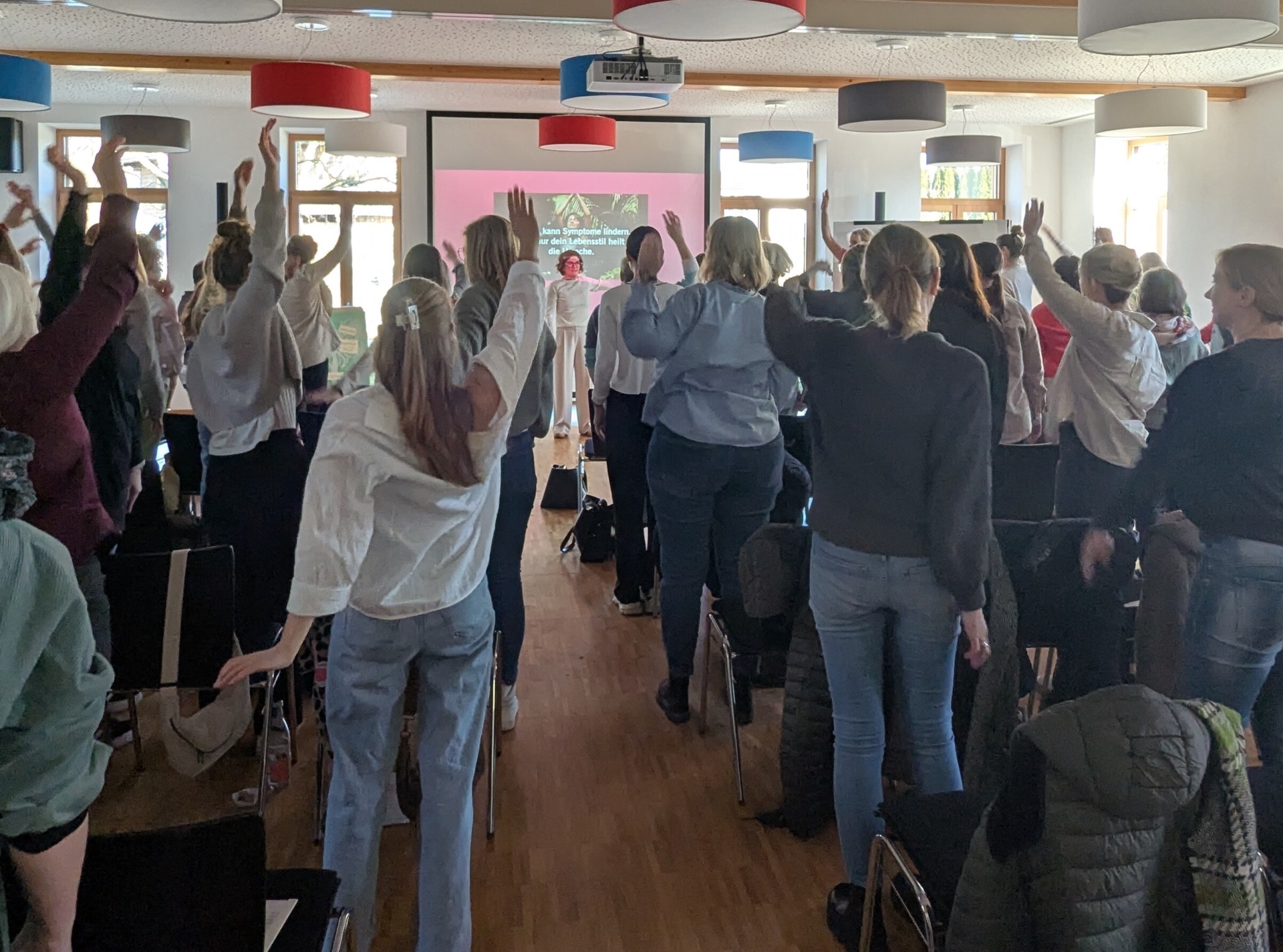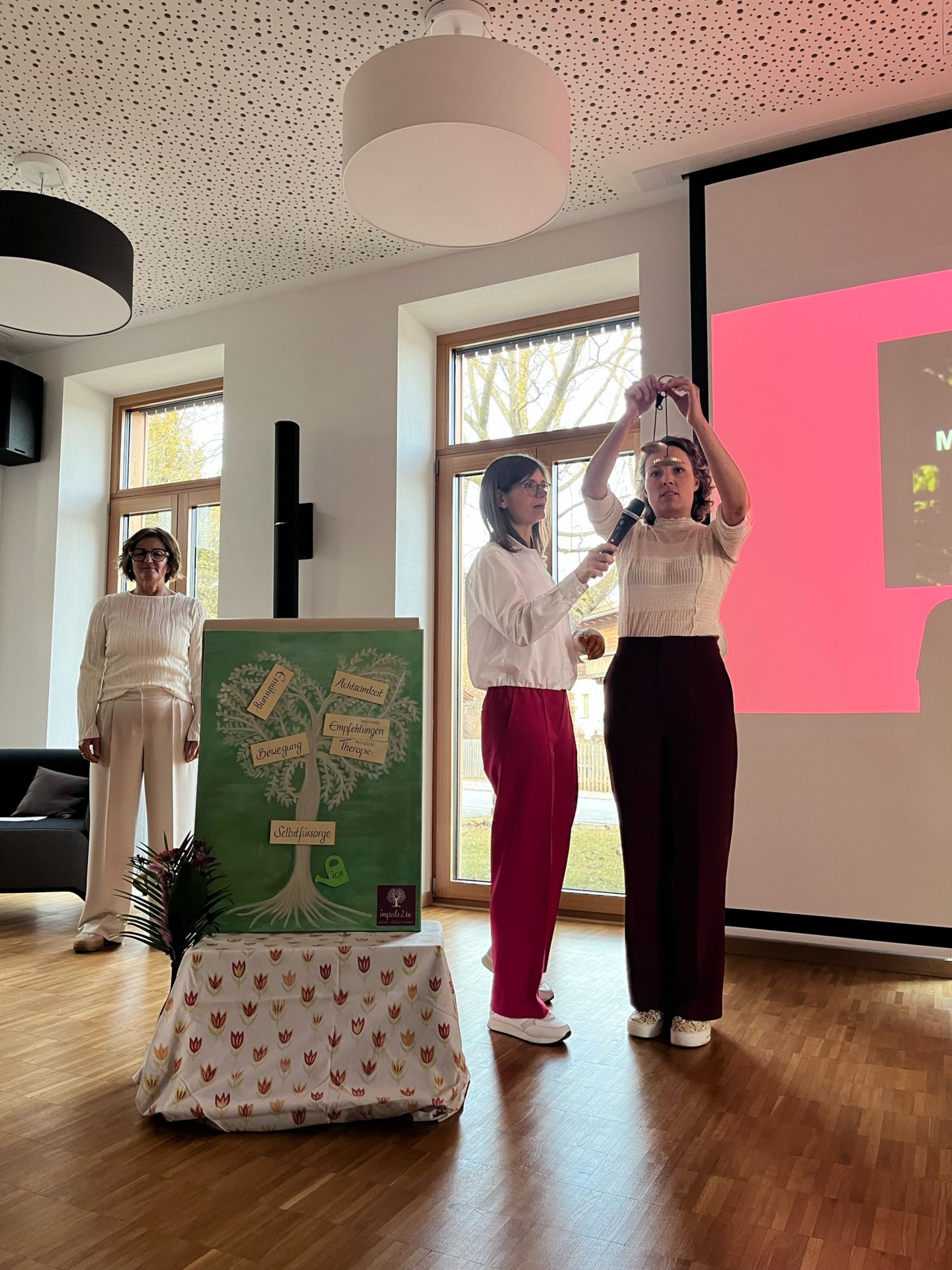 Im Laufe des Workshops waren auch die Zuhörerinnen immer wieder gefordert, so formulierten sie anfangs ihre Erwartungen und hefteten sie an eine Pinnwand, wurden bei Workouts aktiv oder beruhigten ihren Geist bei Achtsamkeitsübungen. Abwechselnd ergriffen die Referentinnen das Wort und informierten chronologisch und aus ihren eigenen Erfahrungen und teils Leidenswegen über Anforderungen und Herausforderungen im Leben einer Frau, über damit einhergehende oder ausschlaggebende Probleme und Lösungsansätze.